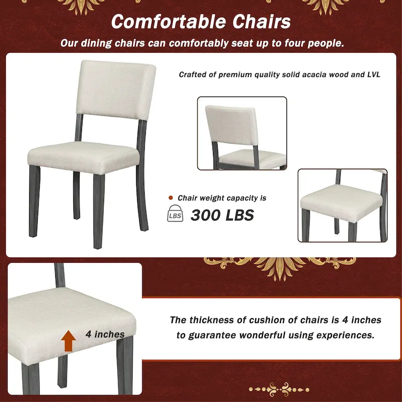 - Our dining chairs can comfortably seat up to four people. The thickness of cushion of chairs is 4 inches to guarantee wonderful using experiences. The durable wood dining chair set that is reinforced with a large thick upholstered seat can make you enjoy an comfortable seating experience. Seat Dimensions: 18.7W x 18.2D. Each chair comes completely with wide seating.
