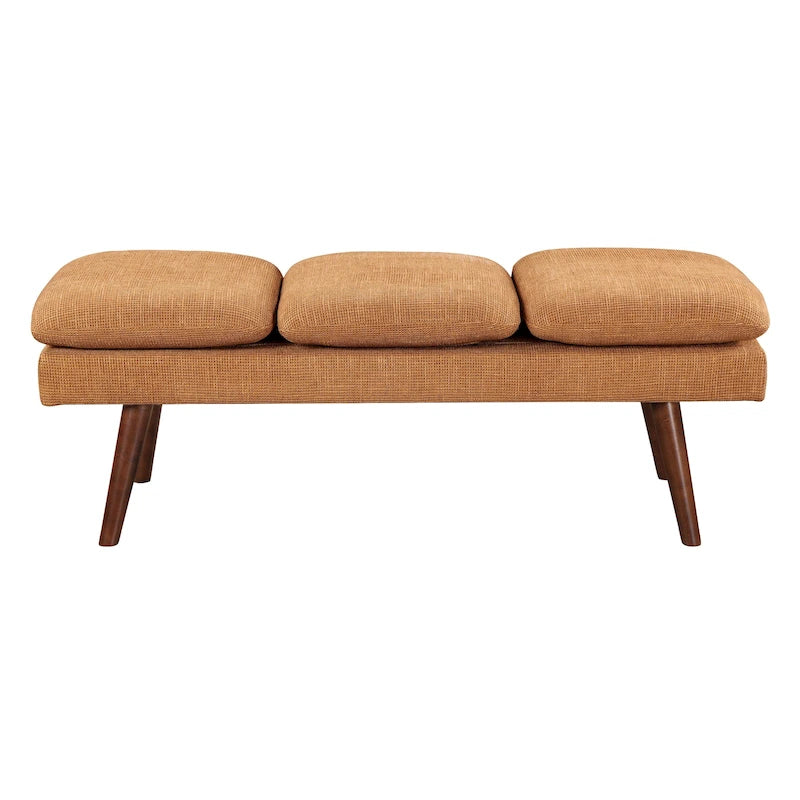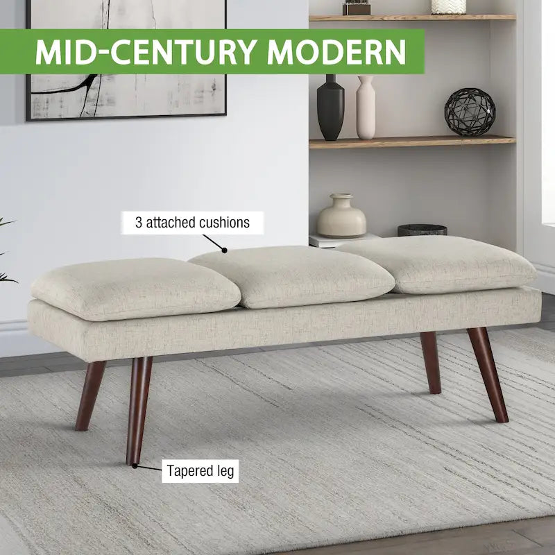Add contemporary appeal to your entry, dining room or guest room with our versatile 54 Mid-Century Modern upholstered bench. Perfect for adding definition to an entry. Ideal for giving that finishing touch to a cozy guest room and a smart way to add extra seating in the dining room. Trendy tapered leg in solid wood and three attached cushions create a sophisticated design perfectly in place anywhere in your home.