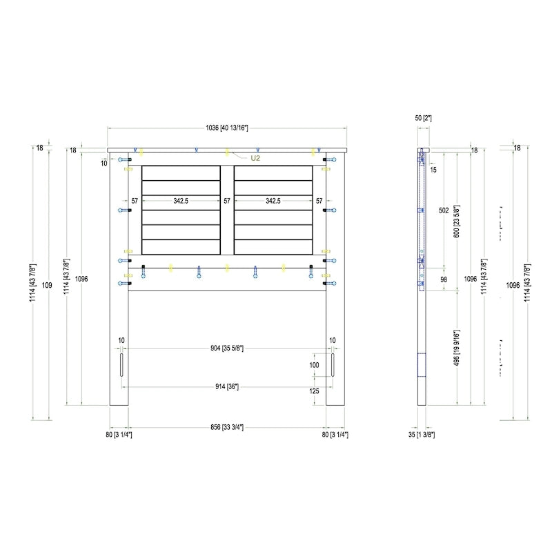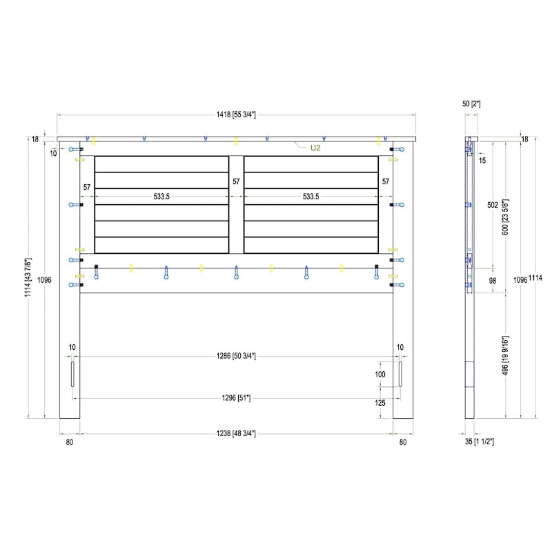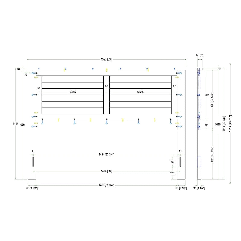 - Campagne Queen: Overall Dimensions: 63 (1596mm) x 43 7/8 (1114mm) x 2 (50mm) Height to Top of HB Panel: 1096mm Height of Headboard off the Floor: 19 9/16 (496mm) Overall Headboard Panel: 55 3/4 (1416mm) x 23 5/8 (600mm) Height of Inset Panels: 502mm Horizontal Border Slat Height: 15mm Bottom Horizontal Slat Height: 98mm Leg Dimensions: 3 1/4 (80mm) x 43 1/8 (1096mm) x 1 1/2 (35mm) Mounting Hole Distance Center to Center: 58 (1474mm) Mounting Hole 50 3/4 (1286mm): 57 3/4 (1464mm) Mounting Hole Size: 10mm x 100mm Mounting Hole Height from Ground: 125mm Top Trim Dims: 63 (1596mm)18mm50mm Inset Slat Width A: 3 (58.6mm) Inset Slat Width B: Angle of Slats: Width of Angled Panels: 622.5mm Vertical Inset Slat Width: 57mm