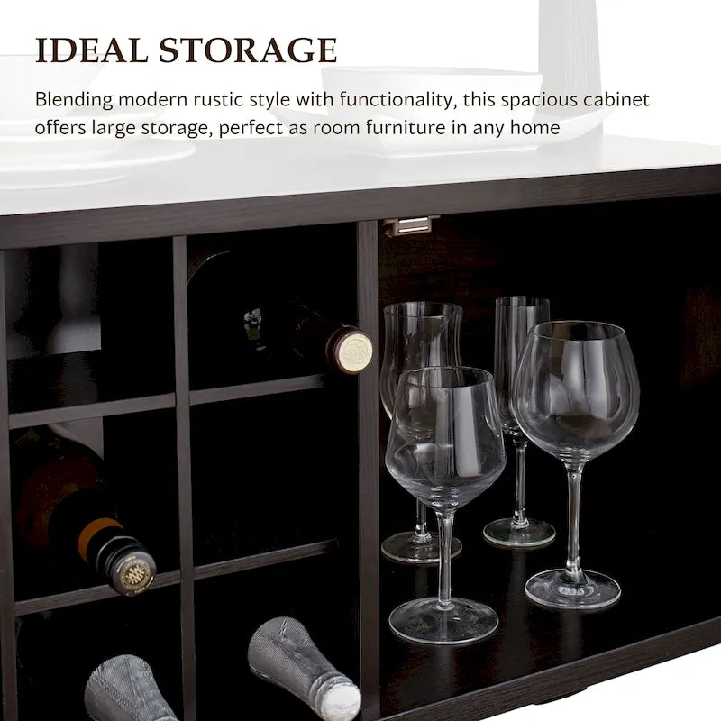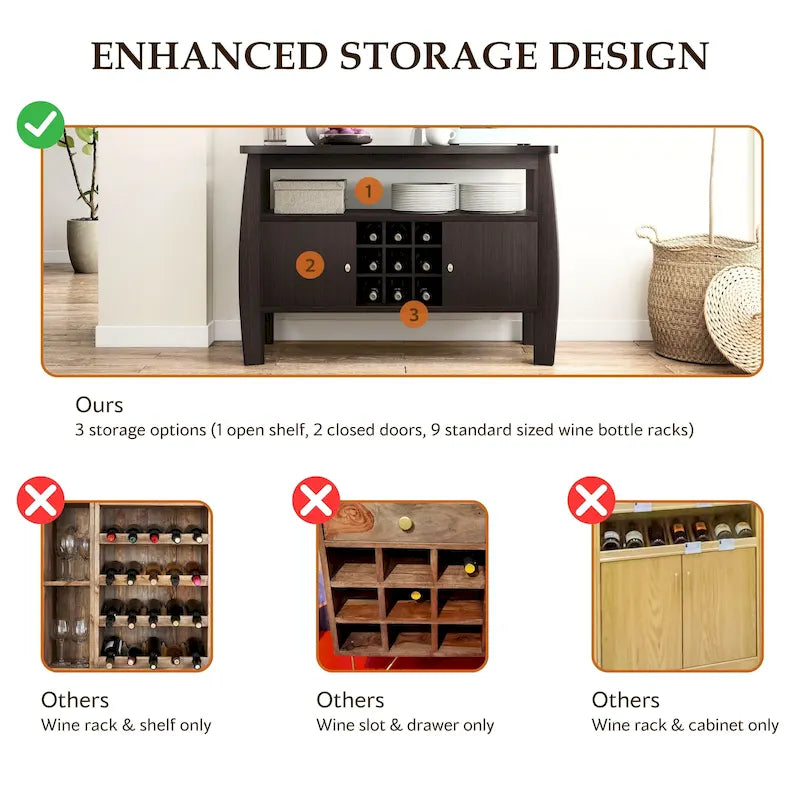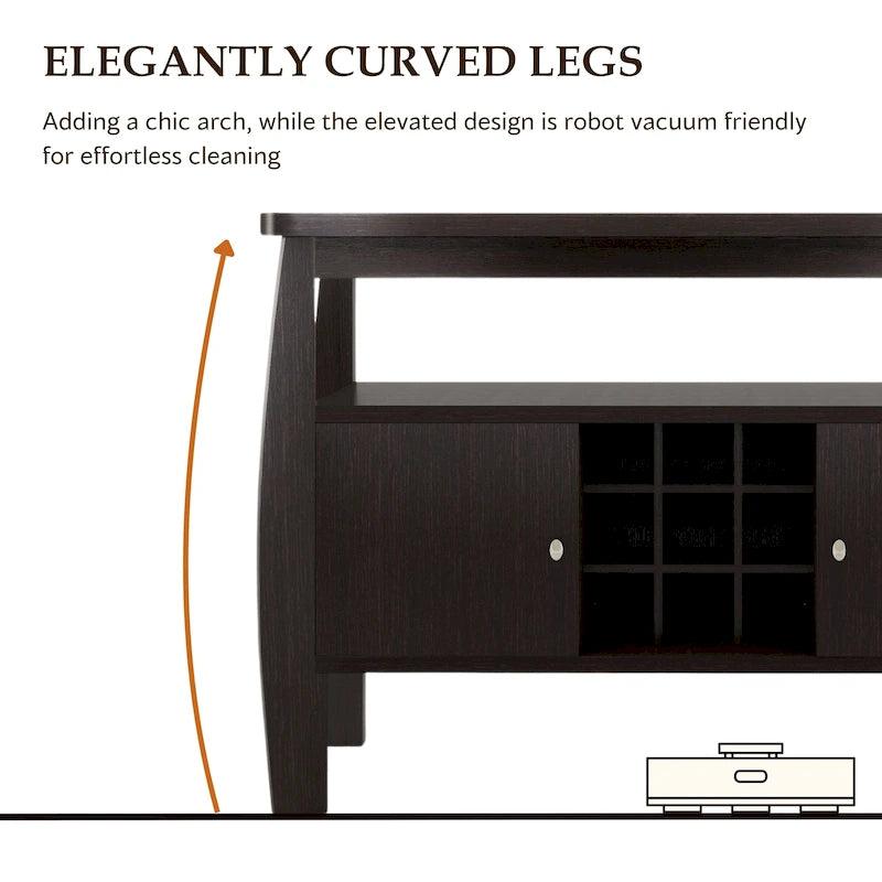 Keep your dishes, bar supplies, and more organized with this stylish buffet table. This table features a wide top with an open shelf beneath it, as well as two closed cabinets and an open wine bottle shelf. The wine bottle shelf features compartments for up to nine wine bottles.