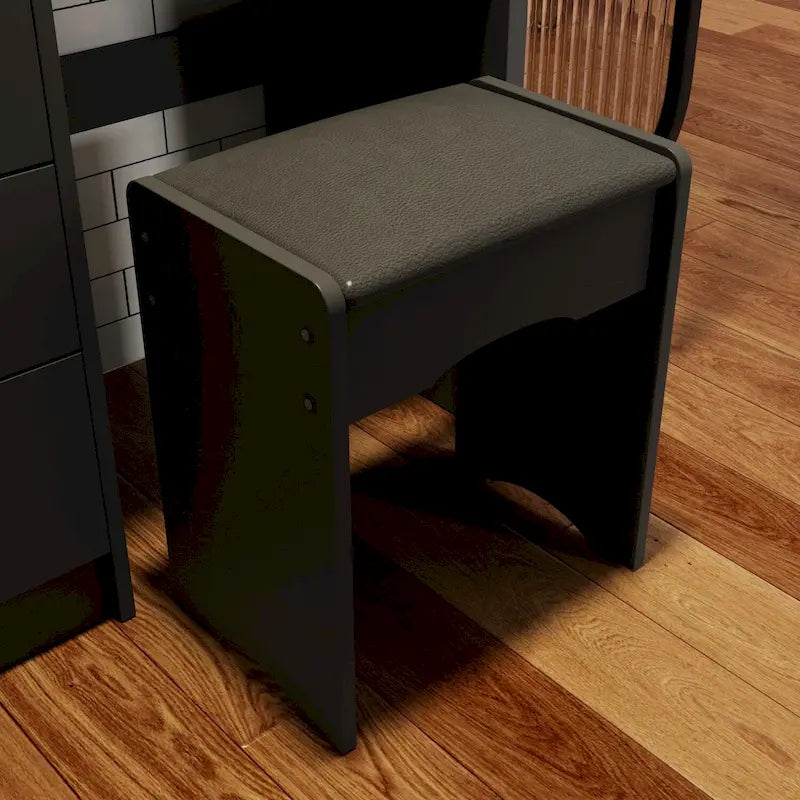 - Round mirror and cushioned stool for added elegance