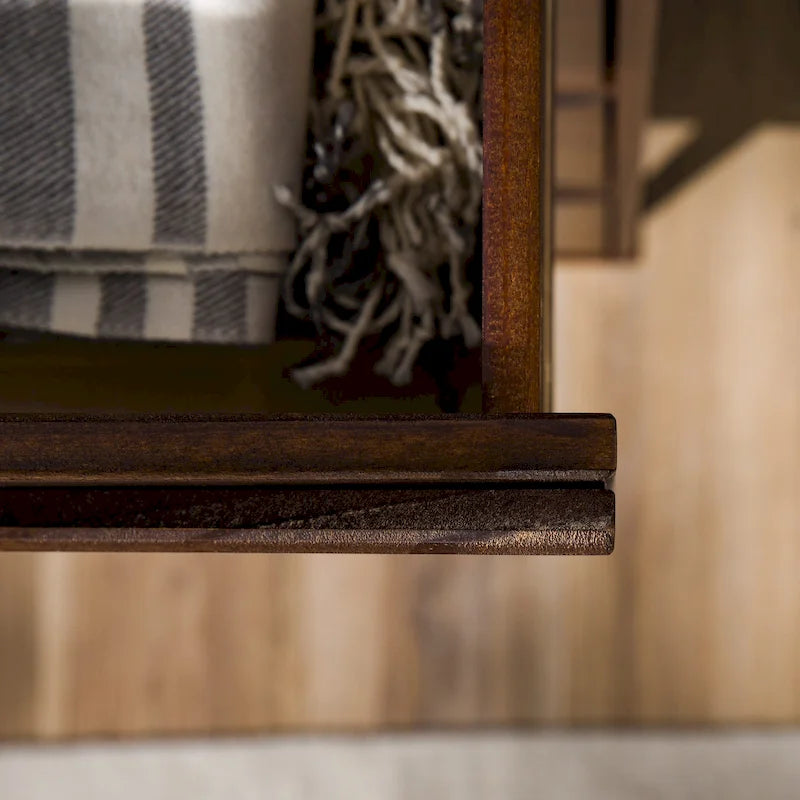 - Beveled drawer detail lends a mid-century modern aesthetic
