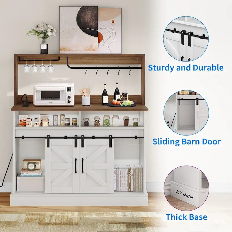 Farmhouse Coffee Bar Cabinet with Power Outlets, Goblet Holder, 47 Sideboard Buffet Cabinet Sliding Barn Door Modern White Wine Cabinets for Home Kitchen Dining Living Room