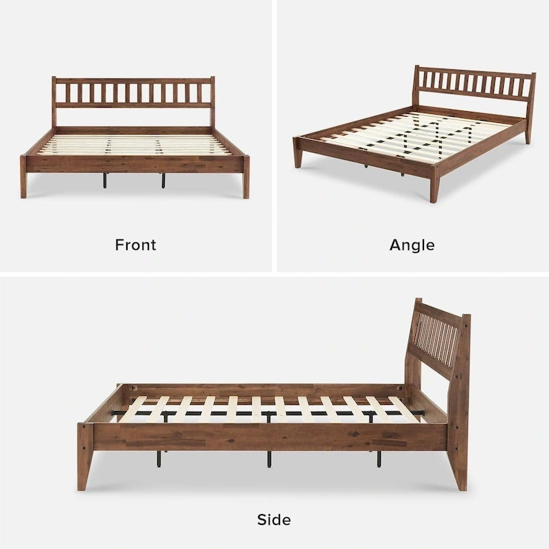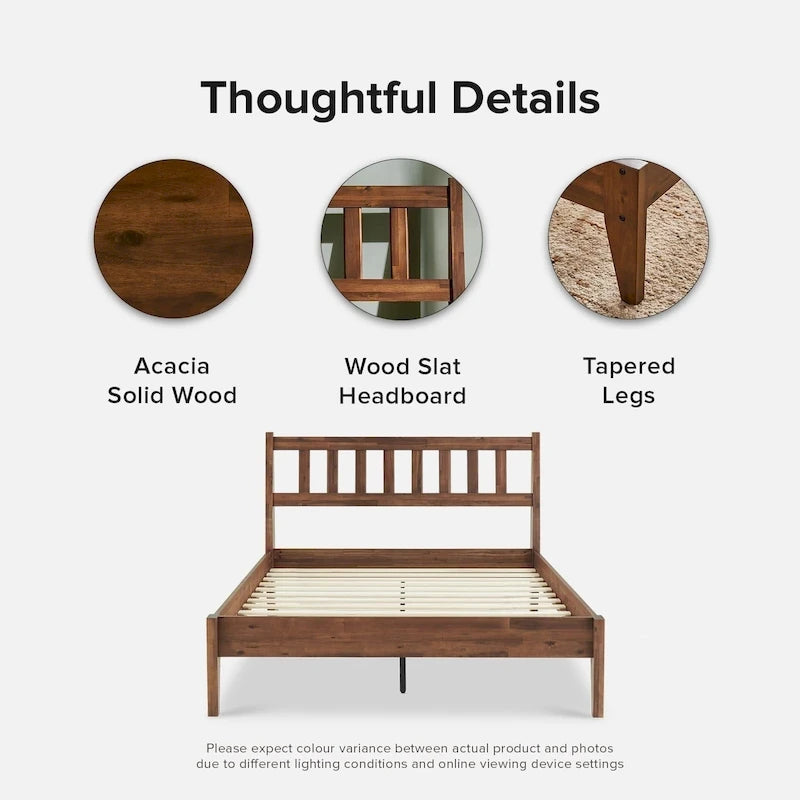 Introducing the Ted Bed, a statement piece for the bedroom, designed with both style and comfort in mind. Available in a classy walnut color, this platform bed comes in 4 sizes Twin, Full, Queen and King sizes, built from 100% solid acacia wood, coated and wired-brushed for scratch resistance and long-lasting use. The slated headboard and tapered legs are signature mid-century modern design elements that exudes a timeless charm. The headboard is ergonomically slanted, great for leaning back and reading a good book or watching your favorite show. Our commitment to your well-being ensures an enduring construction and easily fastened plywood slats that eliminates the need for box spring, providing even weight distribution and extra sturdiness, for worry-free use. Simply add your choice of linens and pillows to enjoy a good night's sleep. Rest easy and recharge in style with Ted.
