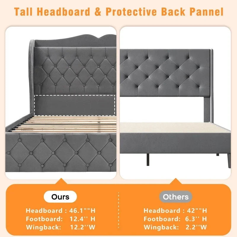 Size:FullMaterial:Velvet Upholstered/ Wood/ MetalProduct Dimensions:81.1L x 56W x 46.1HStyle:ModernSpecial Feature:Upholstered Bed with Charging Station, Squeak Resistant, Upholstered Bed with Storage Drawer & Headboard ShelfColor:GreyFinish Type:OtherIncluded Components:Wingback, Headboard, Slat, Drawer, FootboardUPHOLSTERED BED WITH 4 STORAGE DRAWERUpgrade your bedroom with our stylish and functional Queen Bed Frame. It features 4 under-bed drawers for ample storage, with rolling wheels for easy access. The sturdy steel frame and strong wood slat support ensure durability and a maximum load capacity of 1000 lbs. Enjoy a clutter-free space and enhanced comfort with this modern bed frame.LUXURIOUS BED WITH STORAGE HEADBOARD & CHARGING STATIONThe built-in storage shelf with charging station keeps your electronic devices conveniently within reach. The luxurious wingback design and tall, padded headboard offer comfort and style.STYLISH & COMFORTABLEThe dense foam padding offers a comfortable touch, while the tall, padded headboard provides extra softness for activities such as reading, working, or lounging in bed.STORAGE SHELF WITH CHARGING PORTOur bed is equipped with a convenient storage shelf that includes built-in 15w fast charging ports (including 2 Outlets, 1 Type-C & 1 USB ports).LARGE STORAGE DRAWERThis bed features four spacious under-bed drawers with convenient rolling wheels, offering ample storage space for bed sheets, off-season clothing, and more.TALL HEADBOARD WINGBACKOur bed features a grand 46.1 tall wingback headboard, providing excellent support for your head and shoulders when leaning back.LUXURIOUS VELVET FOOTBOARDThe intricate detailing, button tufts, and curved edges create a luxurious and comfortable atmosphere in your bedroom.PROTECTIVE BACK PANNELIt acts as a protective barrier, keeping items from falling behind the bed and potentially causing damage.