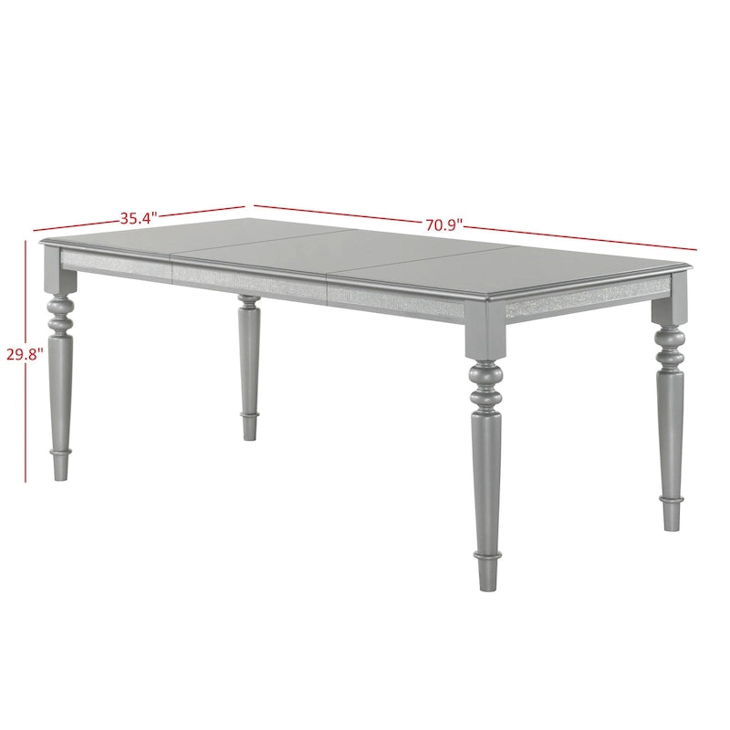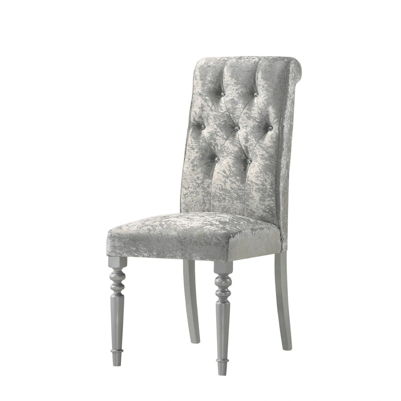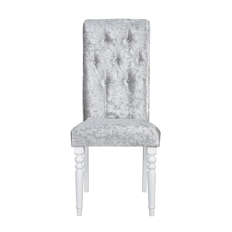 Enhance your dining room look with this sensational modern design dining set. An eye-catching dining table adorned with shiny rhinestones along with four legs in turned legs design. Plus, Shiny Silver Grey parson chair decorated with diamond tufted backrest and two front chair legs designed with turned legs together with two back legs designed with tapered legs brings a luxurious look.