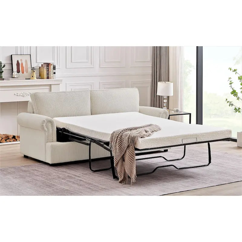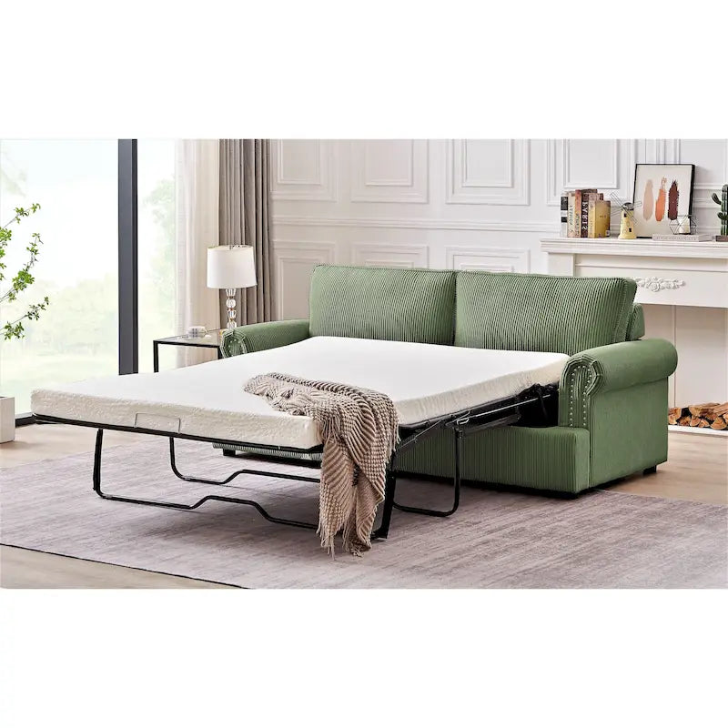 Anchor your living room seating group with this sleeper sofa, featuring a classic round arm silhouette and cushion backs. It extends to a queen-sized bed that's just right for overnight guests. This Sofa Bed its cushions are filled with foam, with mattress has a wooden frame and metal mechanism that makes it tough and durable, brings spare sleeping space and glam style to your living room. It is covered in Corduroy Fabric, which gives you the much needed comfort and rest. The mattress is in high density foam will serve you a relaxable resting. It is suitable for residential as well as commercial use. The sleeper sofa comes with a pull-out bed that includes an foam mattress. The mechanism is made from heavy gauge steel giving the bed a 500 pound weight limit. Quality seating construction in the seat cushion will promote comfort and support every time you sit in the furniture.