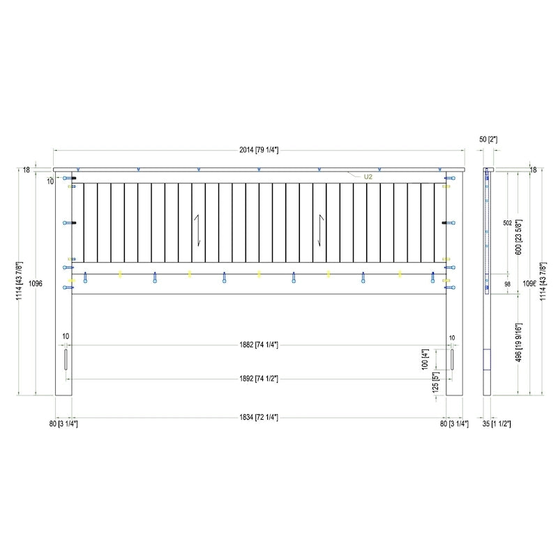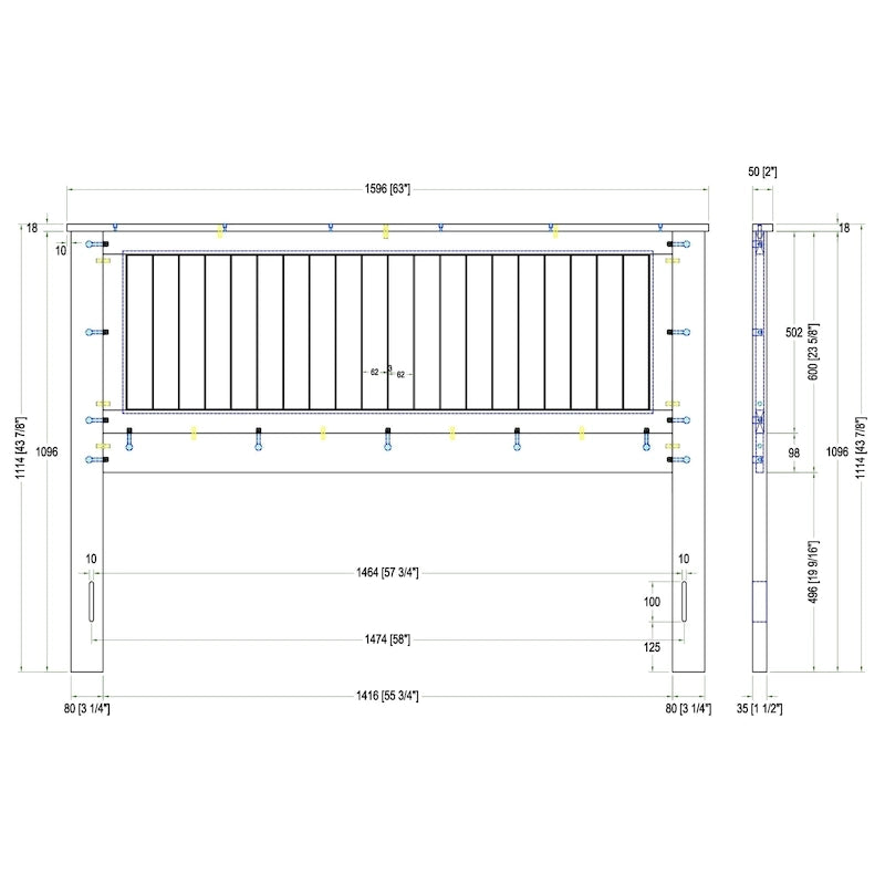 - Wainscott Queen: Overall Dimensions: 63 (1596mm) x 43 7/8 (1114mm) x 2 (50mm) Height to Top of HB Panel: 1096mm Height of Headboard off the Floor: 19 9/16 (496mm) Overall Headboard Panel: 55 3/4 (1416mm) x 23 5/8 (600mm) Height of Inset Panels: 502mm Horizontal Border Slat Height: 15mm Bottom Horizontal Slat Height: 98mm Leg Dimensions: 3 1/4 (80mm) x 43 1/8 (1096mm) x 1 1/2 (35mm) Mounting Hole Distance Center to Center: 58 (1474mm) Mounting Hole 50 3/4 (1286mm): 57 3/4 (1464mm) Mounting Hole Size: 10mm x 100mm Mounting Hole Height from Ground: 125mm Top Trim Dims: 63 (1596mm)18mm50mm Inset Slat Width A: 3 (58.6mm) Inset Slat Width B: Angle of Slats: Width of Angled Panels: Vertical Inset Slat Width: